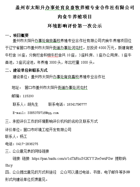 蓋州市太陽升辦事處育良畜牧養(yǎng)殖專業(yè)合作社有限公司 肉食牛養(yǎng)殖項(xiàng)目 環(huán)境影響評(píng)價(jià)第一次公示